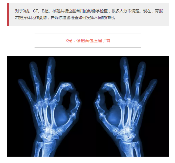 就像一片面包或一块棉花,看不到里面的纤维纹理,但用手压瘪了会清晰一些。X光最大缺点是受制于深浅组织的影像相互重叠和隐藏,有时需要多次多角度拍摄X光片。