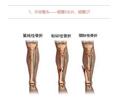 各种外伤,如果怀疑伤到了骨头,优先选择X光照片,检查结果快速易得。若要进一步观察,可以选择CT。超声、核磁对于骨皮髓质等看不大清,一般不选择。