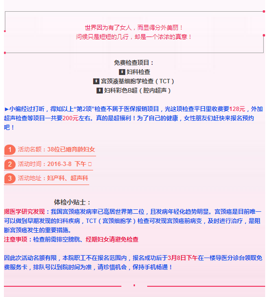 为庆祝“3🎀8”国际妇女节,我院特推出女性健康免费体检,让你悄悄爱上我!